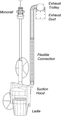 This unique design allows the fume collection hood to follow any emission source automatically. The flexible connection between the hood and the trolley provides a large amount of movement latitude without distorting the seals on the exhaust duct.